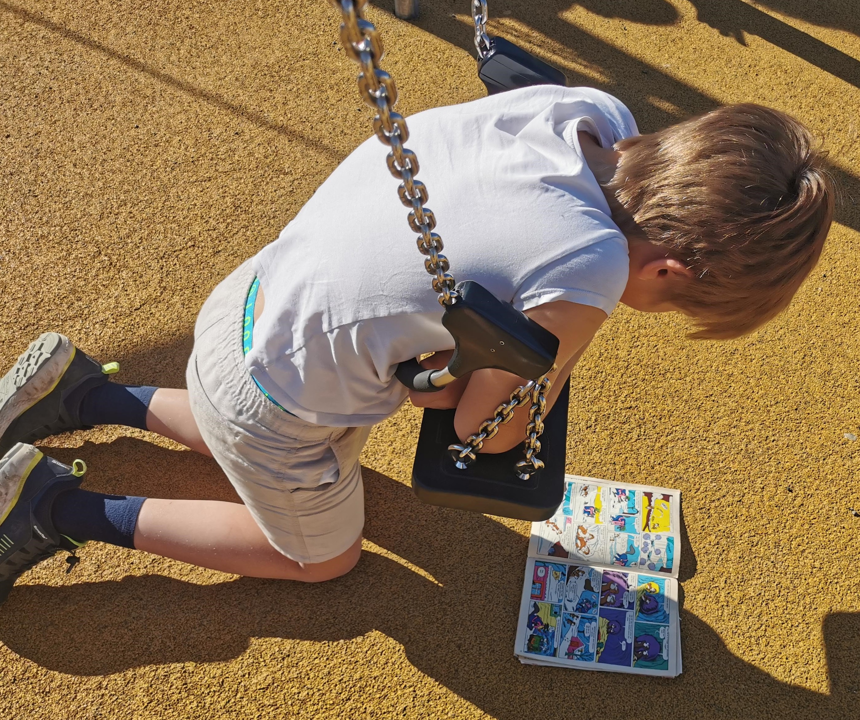 Elever på 5. trinn koser seg i sola mens de utvikler leseferdigheter
