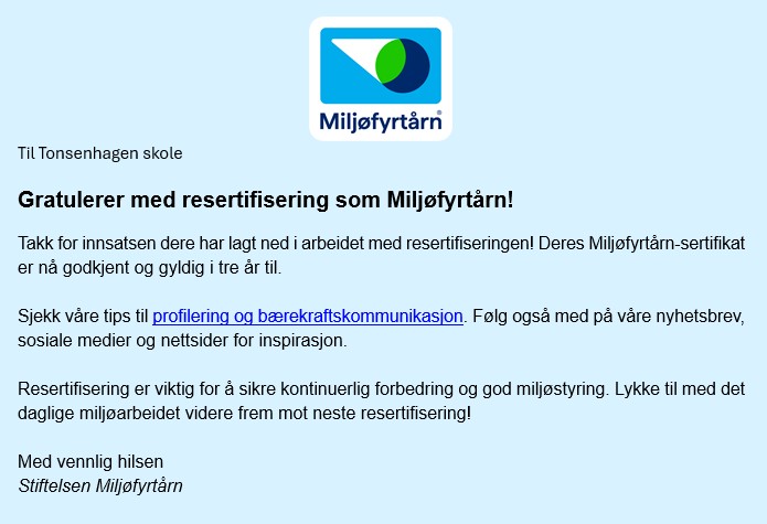 Tonsenhagen skole er fortsatt Miljøfyrtårn-sertifisert!